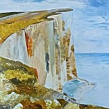 Vulkaaneiland, is geschilderd op zijde, met zijdeverf, is ingelijst en onder glas, 55 cm. x 55 cm. inclusief lijst van zilverkleurig materiaal.