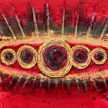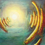 Acryl op paneel. Katoenen garen gespannen op frame dat tevens als lijst dient (niet op foto). Hierdoor is het garen op afstand van het schilderij gezet. De geometrische vormen zijn een ode aan Pythagoras, zijn filosofie en vegetarische levensstijl.