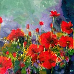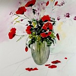 Een globale impressie van het schilderij "Kippen" 100x100cm.