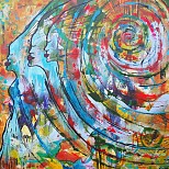 Een globale impressie van het schilderij "Hiding in the background" 80x80cm.
