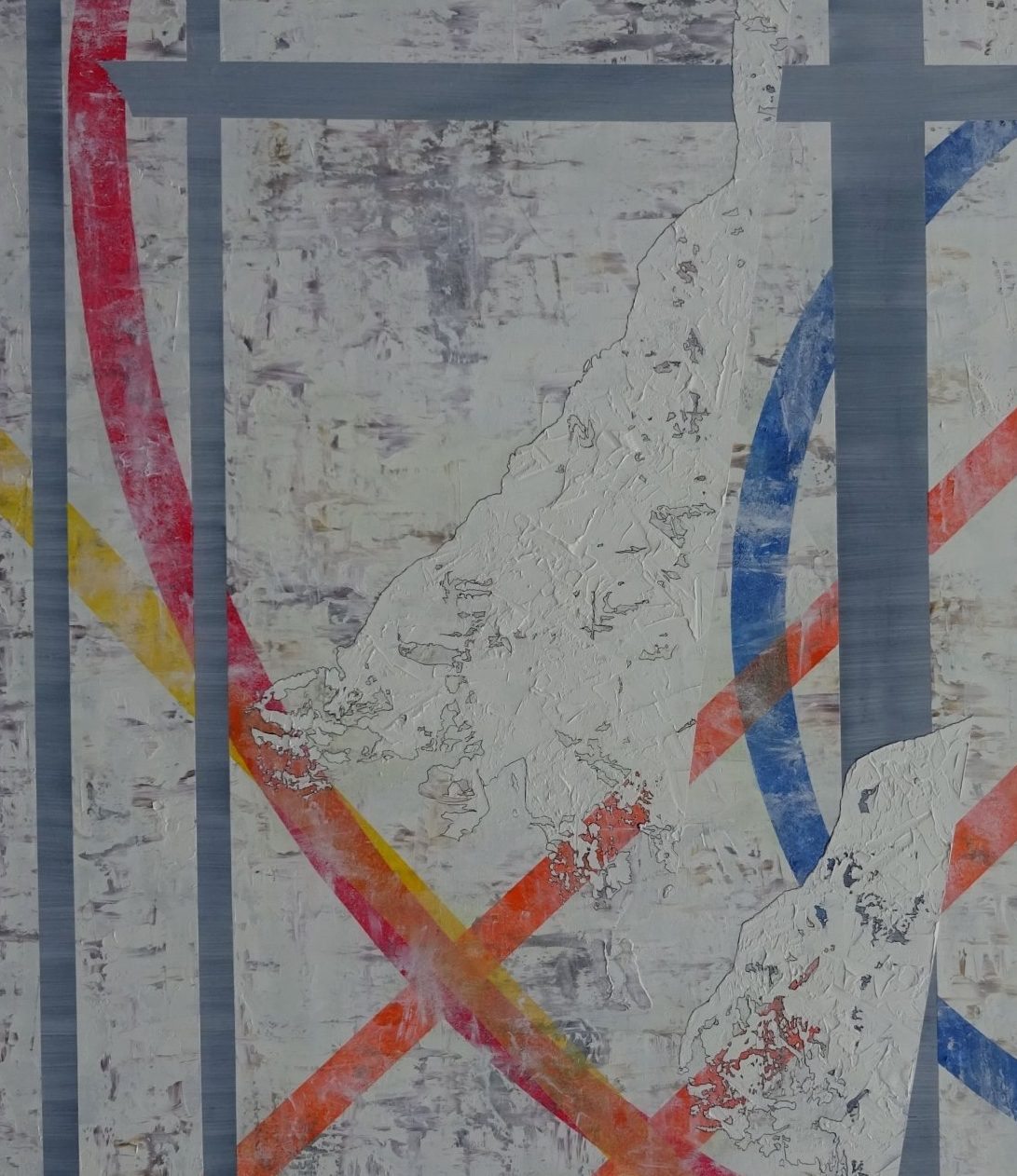 Abstract schilderij geïnspireerd op het lijnenspel in gymzalen en sportvelden. Uitgevoerd in Olieverf en inkt op linnen. Ingelijst (stalen baklijst) en gesigneerd.