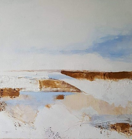 In mooie frisse kleuren een lust voor het oog. Heel prettig om naar te blijven kijken. De olieverf heb ik deels aangebracht met een paletmes.Lapjes laken heb ik gescheurd en opgeplakt.