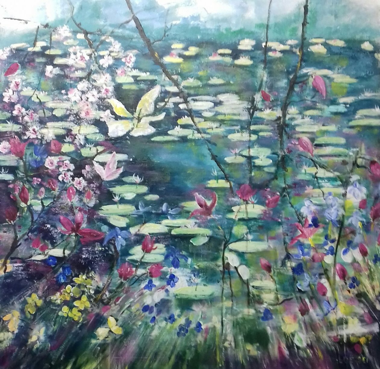 Een globale impressie van het schilderij "Tuinen van giverny" 100x100cm.