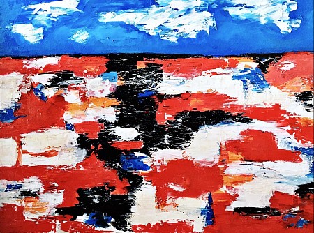 "Noordkaap" Olieverf op canvasdoek. Abstract kunstwerk in de stijl van o.a. Jan Cremer en de Cobrabeweging jaren 50. Afmetingen kunstwerk 60 x 80 Cm.
