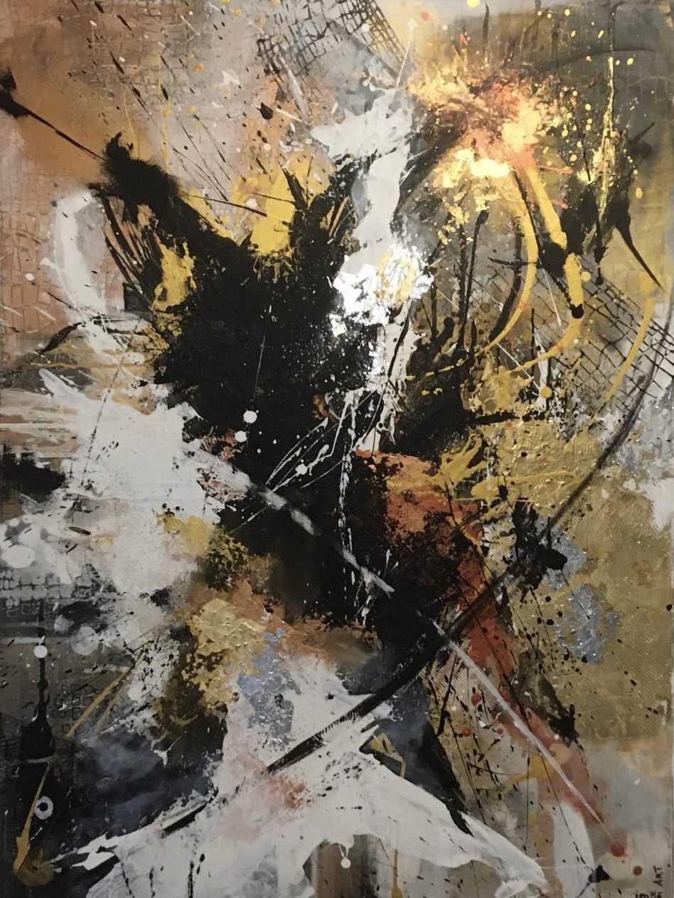 Schilderij mixed media 80 x100x3,5 cm. Acryl op canvas 3 D doek. Verwerking met blad goud en blad zilver, glas granulaat, goud poeder. Afwerking mat vernis+ . Ophangsysteem.