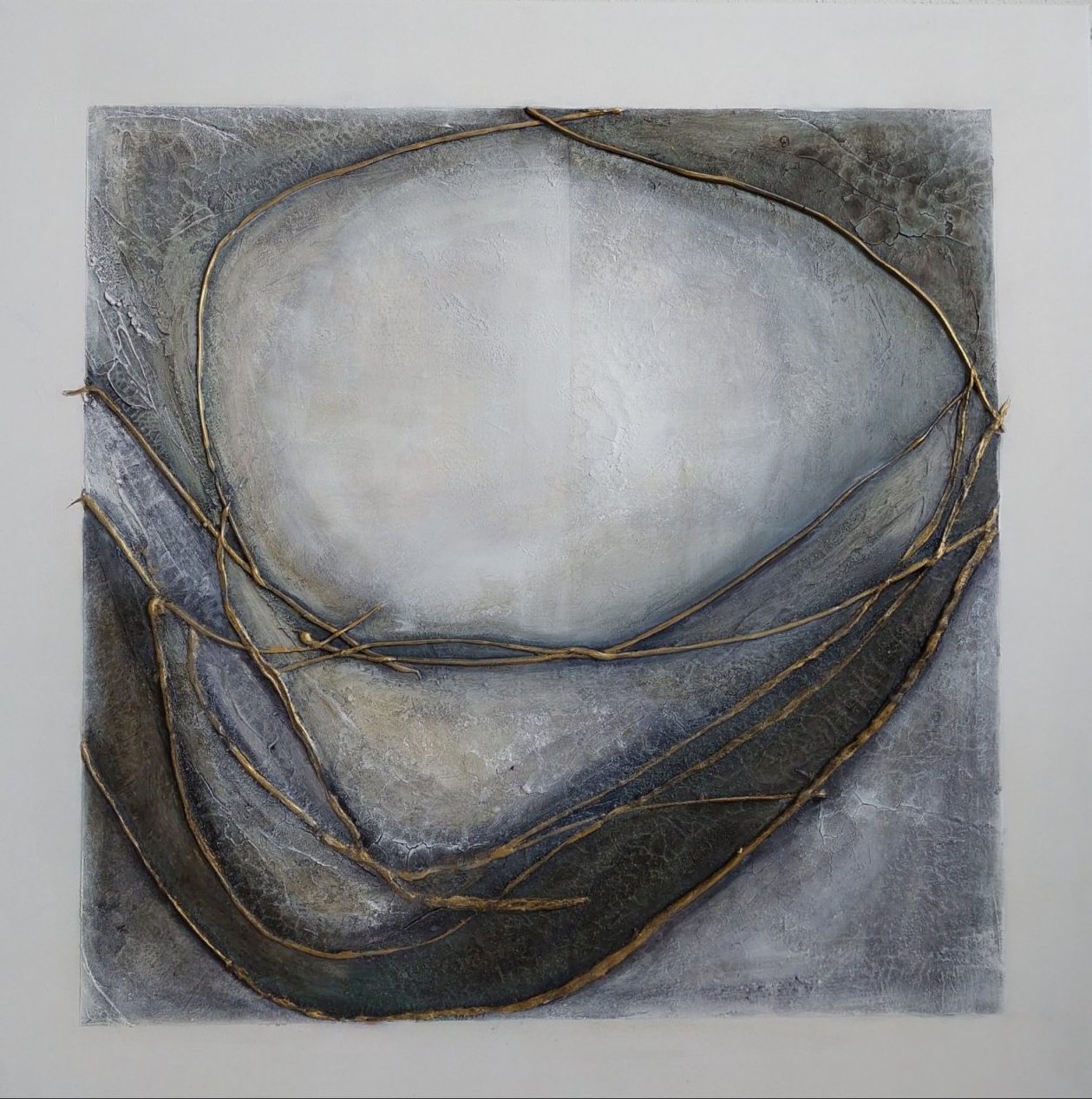 Een globale impressie van het schilderij "Wave afther wave" 90x90cm.