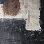 Klein Squary zit in een lijst met gebroken witte passe partout en zit in een zwarte lijst waarvan de maat 44 bij 44 cm. is.