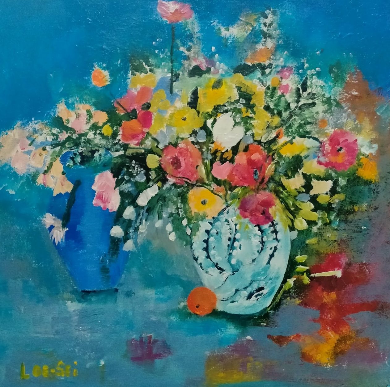 Een globale impressie van het schilderij "Bloemen" 40x40cm.