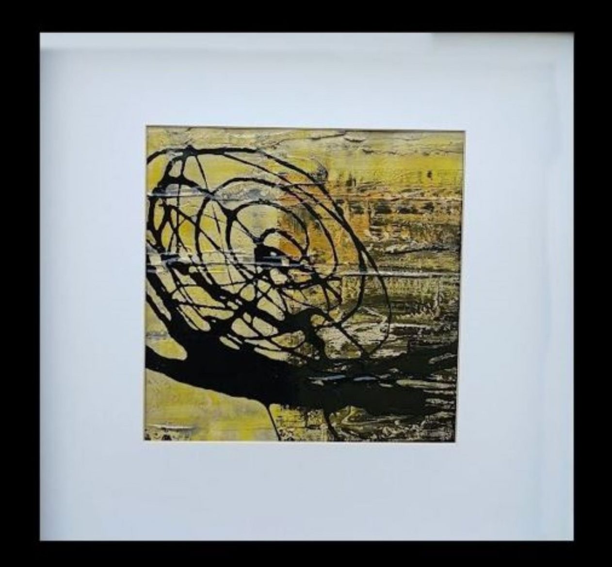 Yellow heeft vele kleuren geel in zich, ook een heel klein beetje oranje en over dat alles zit een ronde baan zwart, welke achteraf een beetje doet denken aan een slak met zijn huisje.
