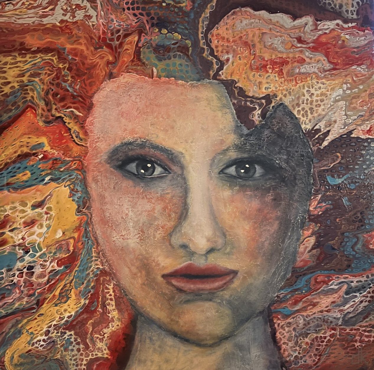 Een globale impressie van het schilderij "Colorfule face" 80x80cm.