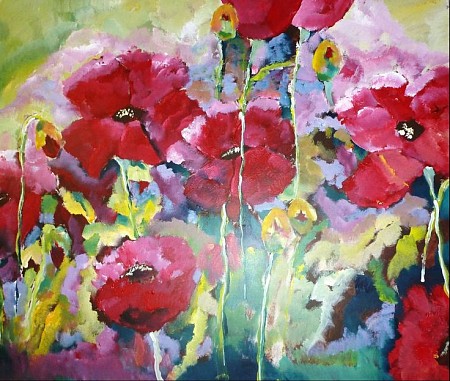 Een globale impressie van het schilderij "Klaprozen" 100x100cm.