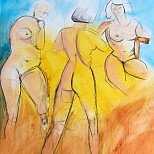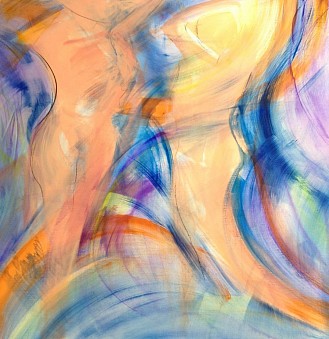 Een globale impressie van het schilderij "Beweging,higgs en de mens" 150x150cm.