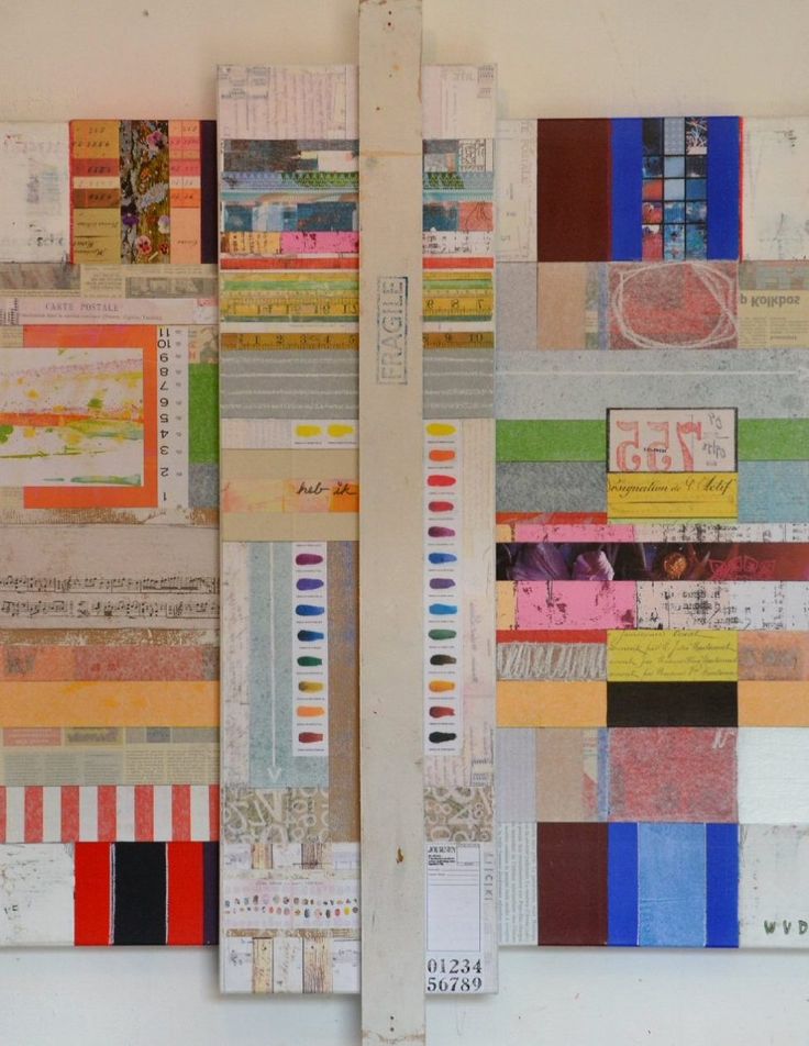 Kleurrijk, doch rustig abstract, modern, mixed media schilderij. Met doek op doek en hout, wat voor de nodige diepte zorgt. Compositie in 3D