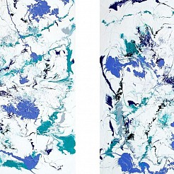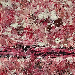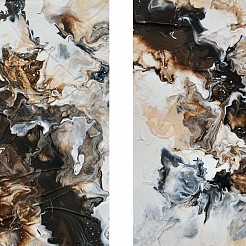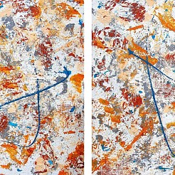 De schilderijen bevatten een gelaagdheid die elkaar afwisselen, waardoor diepte en spanning ontstaan.